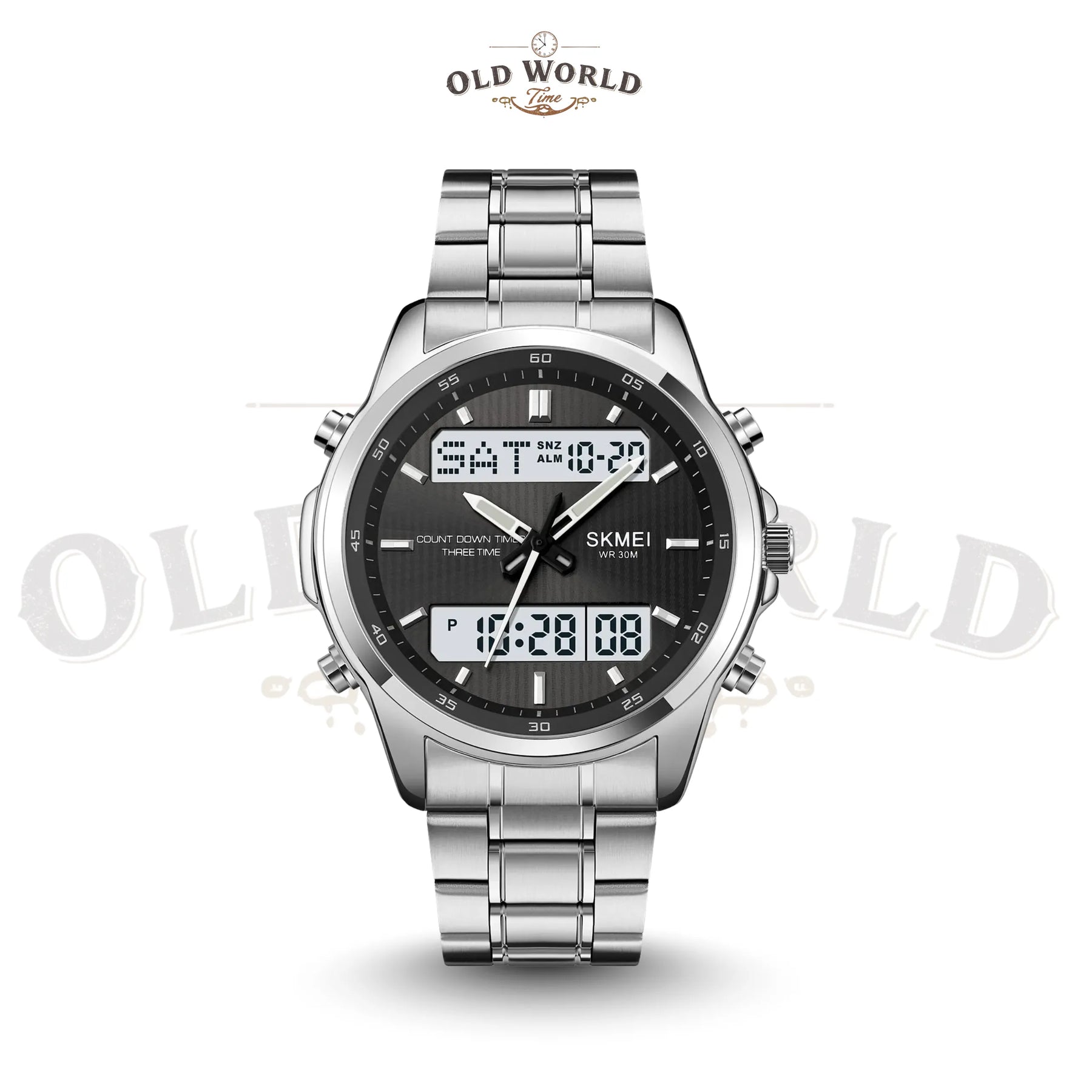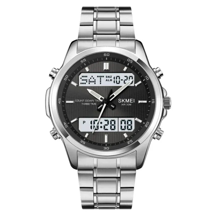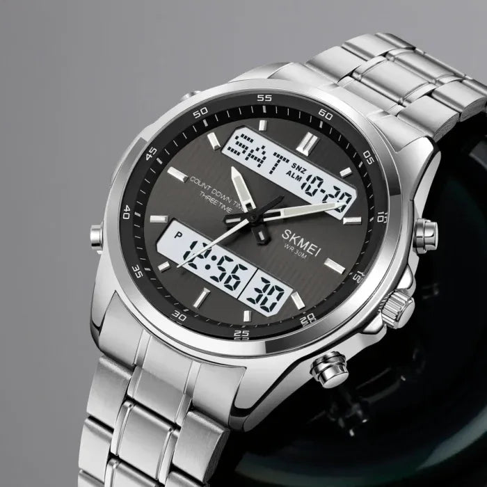 • Dual Display: Combines analog hands with a digital screen for versatile timekeeping.