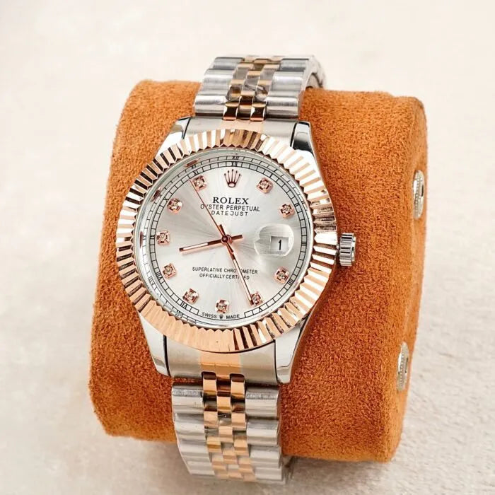• Elegant two-tone rose design with a simple chain-cut dial